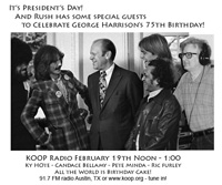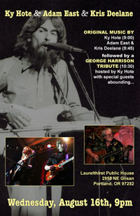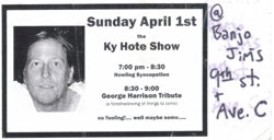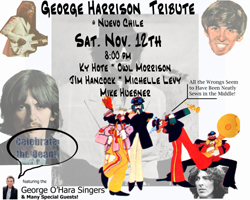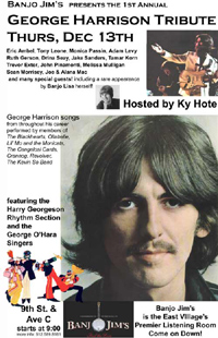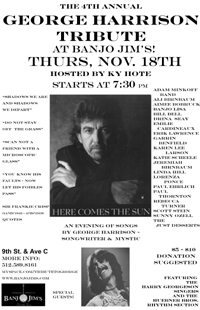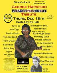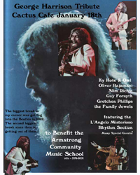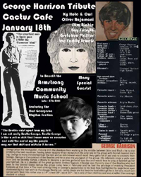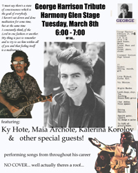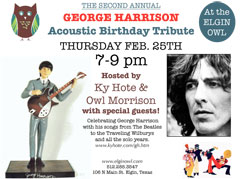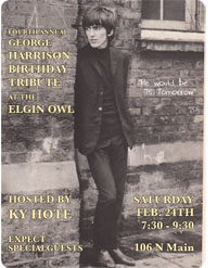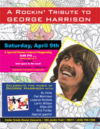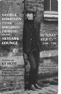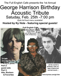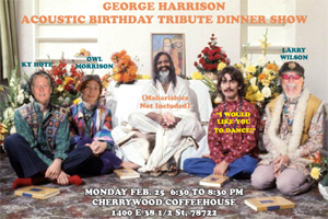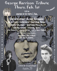 History:The George Harrison Tributes are shows celebrating the music and life of the "Quiet Beatle." They began January 18th, 2005 at the Cactus Cafe in Austin, Texas hosted by Ky Hote and Owl. Everyone recognizes the name George Harrison (Feb. 25, 1943 - Nov. 29, 2001), but many people can't name any of the songs he wrote. Dubbed the "Quiet Beatle" or the "Spiritual Beatle," Harrison's guitar playing established the Beatle sound as much as Lennon & McCartney's songwriting. His well crafted guitar solos were never showy and he never wasted a note. On Rubber Soul, Harrison broadened their sound with the use of the sitar (Norwegian Wood) and Indian inspired compositions (Love You To). Frank Sinatra called Harrison's Something "the most beautiful love song ever written" Other Beatle classics he penned include Here Comes the Sun, Taxman, and If I Needed Someone. Although Lennon was thought of as the "political Beatle," Harrison wrote the most scathing commentary of the ruling class (Piggies). After the Beatles' breakup, Harrison recorded the first "solo Beatle" hits with All Things Must Pass and Give Me Love. Organizing The Concert for Bangladesh set the precedent for Live Aid and its many permeations.