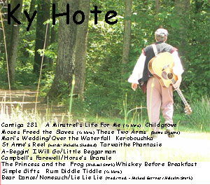 Noted Songwriter and Guitar player Ky Hote recently released his first album of mostly traditional and instrumental music. "A Minstrel's Life" features thirteen songs in the public domain, three songs that are composed by Ky Hote and also songs by Michelle Shocked, Michael Peter Smith and Donna Stjerna of the Folkgrass duo, Still On the Hill. The completely instrumental selections include one completely improvised tune featuring the Dangerous Guitar Playing of Ky Hote. Imagine if you will... strolling down the lane in a time where electricity and motor vehicles are non-existent. The printed word is still a wealthy person's realm and there is no television or internet! Life is hard and pleasures few, but you might come across a crowd of people listening to a minstrel such as Ky Hote. His songs and stories bring the news from far away lands and his humor helps the day go by. Ky Hote has been called The Most Dangerous Guitar Player at Renaissance Festivals across the United States. While other guitar players rely on open tunings and amplified effects, Ky is out of the box with his adventurous arrangements of Celtic, Gypsy, Old Timey American tunes as well as the improvisations of his muse. He is featured in the hammered dulcimer band Featherstone and fearlessly leads a power-celtic group, Celtic Stronghold. Listening to A Minstrel's Life is much like running across Ky Hote in the lanes of a Renaissance Faire. It will surprise you, make you laugh and bring comfort to your heart with its familiarity. Here is what fans and contributors have said after receiving their copy: "A Minstrel's Life. Great job! You've really kept the 4/4 troubadour spirit alive!" ...Michelle Shocked "Your version of These Two Arms is just beautiful. Donna is so thrilled that you chose to record it. Really good picking and it takes you on quite a journey. Wonderful!" ...Donna Stjerna and Kelly Mulhollan of Still on the Hill "The humor and songs are great and the guitar work makes my ears smile. It's a very satisfying listen." ...Daren Appelt "I have... had head space time to take a listen and it is wonderful. I am transported much of the listening dreaming inside movie time to Ireland. My favorite place to tour with the music. I've been over there many, many times and just love the people and the street music and classic Irish music.... You have such a heart and precise simplicity that I would embrace, even if we weren't such old friends and mentors of each other. Thank you for continuing to expand your gift and talent and sphere of love." ... Rex Foster "Your CD came today. Sounds awesome. Would love to have you onboard (for our) 2011 opening." ... Kris Sabbatino, co-producer of Flagler-Palm Coast Renaissance Festival "HOW FUN! WE FELT LIKE WE WERE AT FESTIVAL" ...Leah LaChapelle, author, radio show host "have very much found the cd to be of life and warmth. have not grown tired of or feel that i will anytime soon. thank you much and continued success to your multiple musical endeavors and the joy and freedom you bring to it. it is hard to find freedom in the chains of life but when they start clanging just right it is quite beautiful isn't it." ... Monk E. Wilson "'The Princess and the Frog' is my favorite. I've been listening to your CD back and forth from work for days *grin* " ..... Heidi Bolton " 'A Minstrel's Life' sounds like Spring." .... Suzanne Teshera |