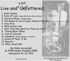 Live and a Bit FetteredThe remaster of the 1990 casssete release: "Live and Unfettered" This recording features many of Ky's most requested original songs over the years. Recorded direct with only Ky vox and Silver, his lovely hollow body silvertone guitar. |