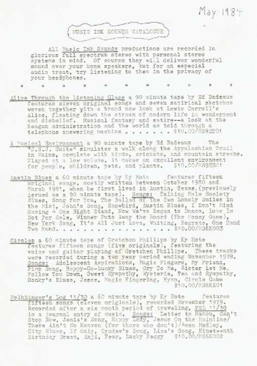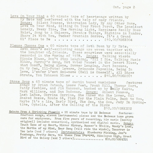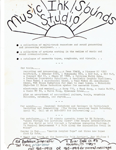 ![]() Artwork above by Soo-See Bell Ky Hote 5/24/15I suffered a loss this month with the passing on of my friend Ed Badeaux (RIP 3/20/1926 - 5/10/2015) and it's a little hard to know how to speak about it because I haven't spoken with Ed in about ten years and I hadn't seen him in about twenty, so many of my current friends haven't met him or heard about him specifically. Yet he was a major influence on my life as a musician and a creative spirit in the universe. I met him when I was thirteen and in my early twenties, when I was traveling, he was someone I visited every year for a few months at a time.Musically he was right in my path when I met him in New York City in 1974. He was a folksinger songwriter guitar player who had worked as managing editor of Sing Out! magazine in the sixties, had a few records out on Folkways and was friends with Pete and Toshi Seeger. We met at the Hey Brother Coffeehouse, which was more of a concept than a coffeehouse. Meeting in an empty storefront, both Ed and I met many people who would be long term friends and musical compatriots. After Ed moved back to Houston and after I started my hobo traveling around the country, we renewed our friendship when I needed a place to stay in Houston. Ed was very accommodating despite his small apartment near the back of Memorial Park, which was down a railroad bridge over Buffalo Bayou. He had moved back to Houston to be close to his parents and his two sons. He got involved with the Houston Folklore Society, the Anderson Fair folk club and KPFT Pacifica Radio. He bought a state-of-the-art portable Nakamichi stereo cassette recorder to record concerts, other musicians and sound effects for his radio show. By the time, I and my two traveling partners got to his house, he was already set up for recording at his apartment using a TEAC 3340-S reel-to-reel tape recorder. Ed is one of the Unsung Heroes. Maybe 'hero' is not quite the right term. Hero sounds like someone who pulls a baby out of a burning building or someone who drafts legislation that insures the rights of all people to vote or be married. The word 'unsung,' however, refers to those people that are not famous. Those people, whose contributions were only noticed by a handful of others. In the world of the arts, there are many musicians, writers, dancers, painters, etc that have produced prolific bodies of work as beautiful and impressive as many of their contemporaries who are making a living at it and are famous. And in every discipline there are those that pioneer new methods of creating art, but aren't the ones that bring the innovation to the public's eye. Ed was an unsung artist - a musician, a writer, a photographer - as well as an unsung innovator. In 1978, Ed's apartment was the first place I'd ever seen a home studio multi-track recording, while today I see that part of a house in the majority of my musician friend's houses. His first available patch-in effect was an echo built from an old Ampeg tape player with a looped piece of tape around the reels, where the play-head engaged immediately after the record-head. If you're under 25, I apologize, I am talking analog-speak here. On his radio show, Nightsong, he did things like playing two songs at once or using 'environments' recordings to blend with songs or with his talking. These are common tools for the modern DJ, but not in 1978. The area that Ed was absolutely ahead of his time was in the use of his telephone answering machine as an outlet for artistic expression. But that comes later in this narrative. Ed was also the first folk musician I met who wanted to blend synthesizers with folk music. During that first visit I recorded my first album of original songs, most of which I'd written growing up in New York City. The next year I recorded a collaboration with the two musicians I was traveling with at the time and also an album of songs by a talented teenage songwriter Ed had introduced me to. I came back in the fall and recorded some of the songs I'd been writing while I was traveling. The next year I established Texas as my home-base for my travels and then I recorded an album of songs I'd written in Austin. I mention these albums because not only were they recordings of my music, they were records of my life and I can use them now to look back at where and who I was. Ed gave me a great gift by encouraging my imagination and giving me a place to freeze it in time like a photograph in stereo. In 1983, Ed invited my partner and me to come live there and formalize our studio as a collective called Music Ink Sounds. We recorded a compilation of Austin artists, I re-packaged my old and current recordings and we displayed our wares at the Kerrville Folk Festival in a crafts booth. We also held workshops in recording and songwriting. Ed taught me a lot about creativity and he extended this even to cooking his favorite meal, his Noodle Dish. Every time he made it, it had noodles, sesame oil and peanut butter. But each time, he's add different ingredients. Almonds, sugar snap peas, hamburger meat... every time he cooked, it reflected his mood, the season and whatever was on sale at the supermarket. He said cooking is like mixing a record. Learn from your experience, use your instincts and always respect your personal taste. From Ed, I learned about Quality with a capital "Q" and how all arts, disciplines and crafts need that essential element. There's all kinds of things made for a profit, but a house built with love, a song that says something real, a live TV show that broke all the rules, these were examples of Quality and that's what's missing in this world! He also taught me about the importance of ceremony and celebration the first time we came to stay with him. Every night after a hard day of playing and recording music, he'd take us out for a scoop of ice cream at Baskin Robbins. He always made it sound like a spontaneous idea each time and it was great way to unwind and talk about the accomplis