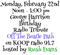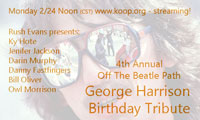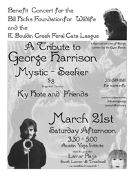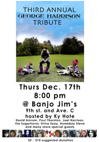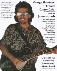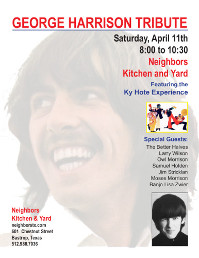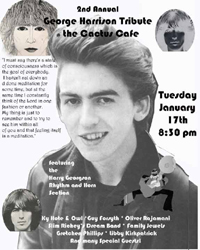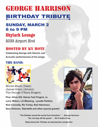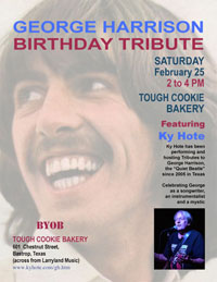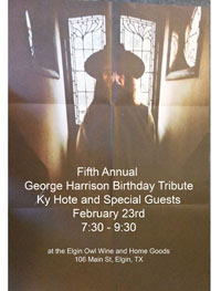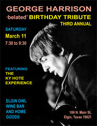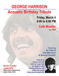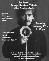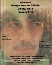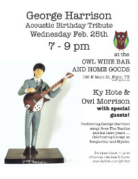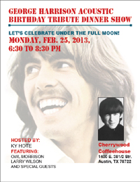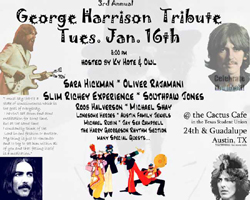 History:The George Harrison Tributes are shows celebrating the music and life of the "Quiet Beatle." They began January 18th, 2005 at the Cactus Cafe in Austin, Texas hosted by Ky Hote and Owl. Everyone recognizes the name George Harrison (Feb. 25, 1943 - Nov. 29, 2001), but many people can't name any of the songs he wrote. Dubbed the "Quiet Beatle" or the "Spiritual Beatle," Harrison's guitar playing established the Beatle sound as much as Lennon & McCartney's songwriting. His well crafted guitar solos were never showy and he never wasted a note. On Rubber Soul, Harrison broadened their sound with the use of the sitar (Norwegian Wood) and Indian inspired compositions (Love You To). Frank Sinatra called Harrison's Something "the most beautiful love song ever written" Other Beatle classics he penned include Here Comes the Sun, Taxman, and If I Needed Someone. Although Lennon was thought of as the "political Beatle," Harrison wrote the most scathing commentary of the ruling class (Piggies). After the Beatles' breakup, Harrison recorded the first "solo Beatle" hits with All Things Must Pass and Give Me Love. Organizing The Concert for Bangladesh set the precedent for Live Aid and its many permeations.